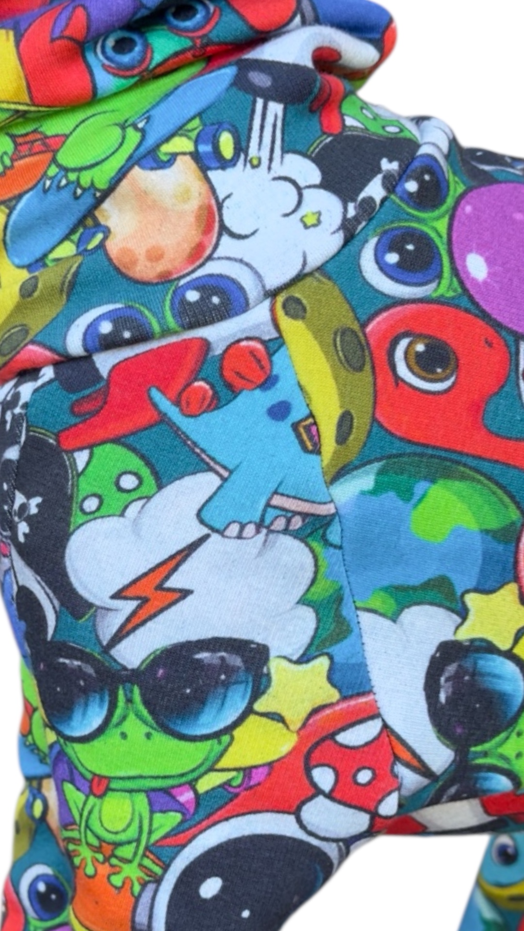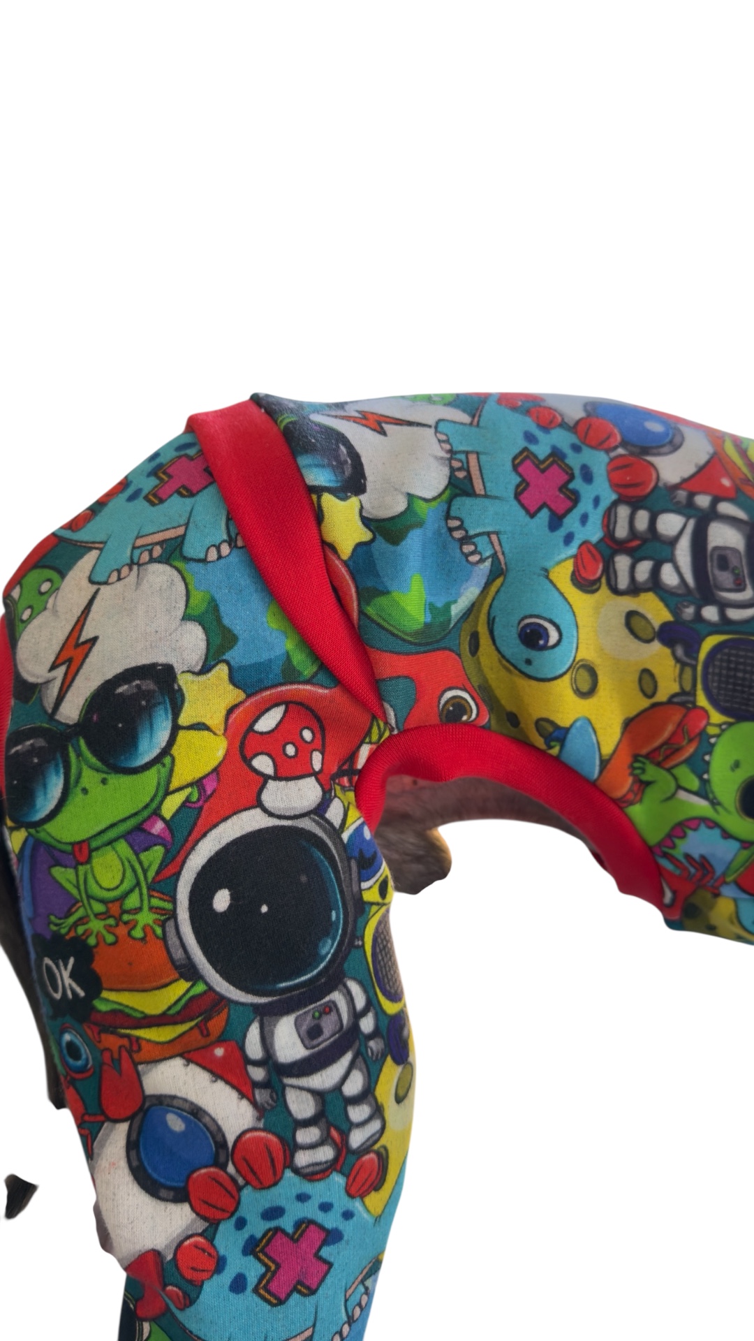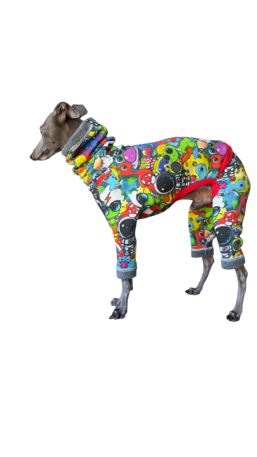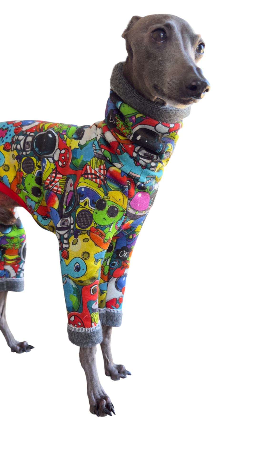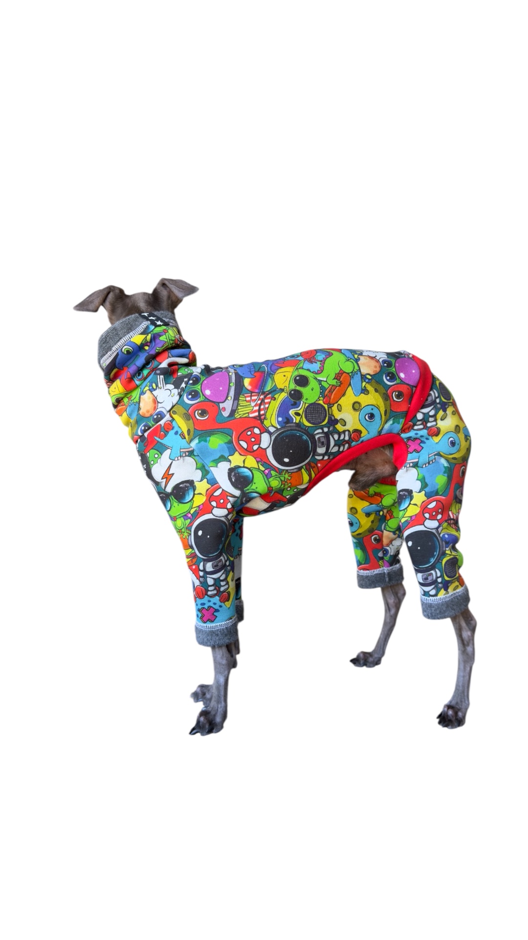 Kolorowy dres Tokio dla charcika włoskiego, we wzory kreskówek to idealne połączenie stylu i komfortu. Ubranie dla psa zostało wykonane z dość grubej i uciągliwej dzianiny, która doskonale dopasowuje się do smukłej sylwetki charcika włoskiego, ale jednocześnie sprawia, że ubranko jest łatwe do ubrania. Czerwone ściągacze dodają charakteru.